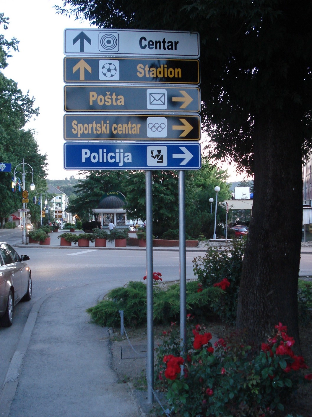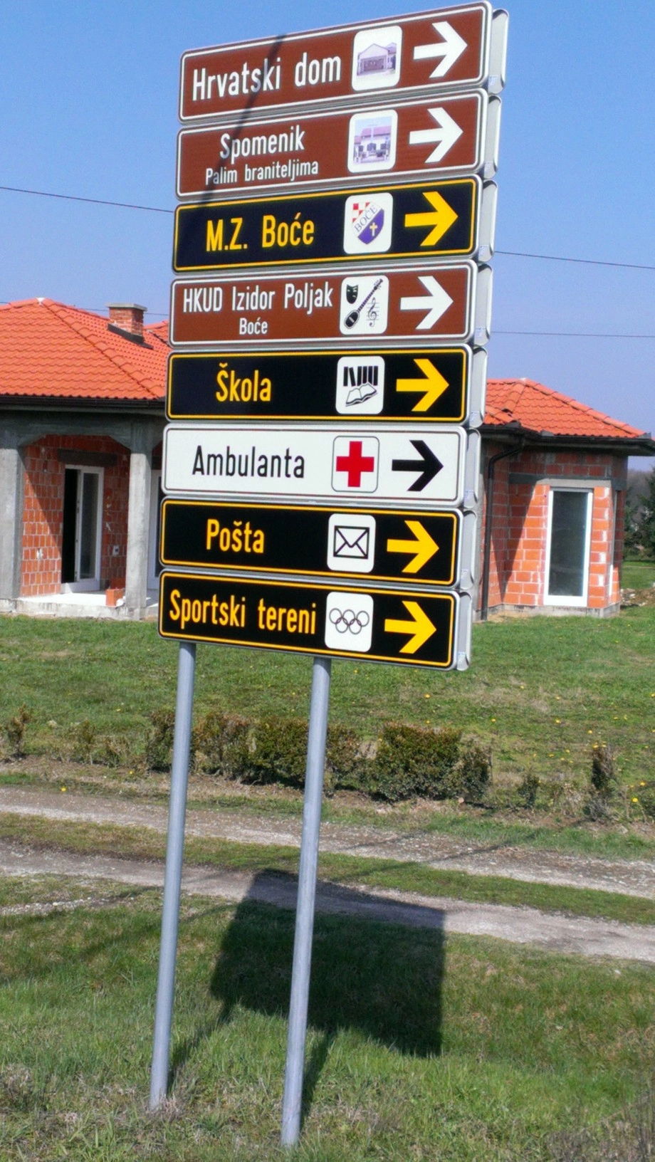 2. znakovi obavijesti za usmjeravanje prema poslovno - trgovačkim centrima, važnim objektima i sadržajima u naselju te ostalim javnim prostorima (izložbe, sajmovi) koji zbog svoje namjene privlače veći broj ljudi.